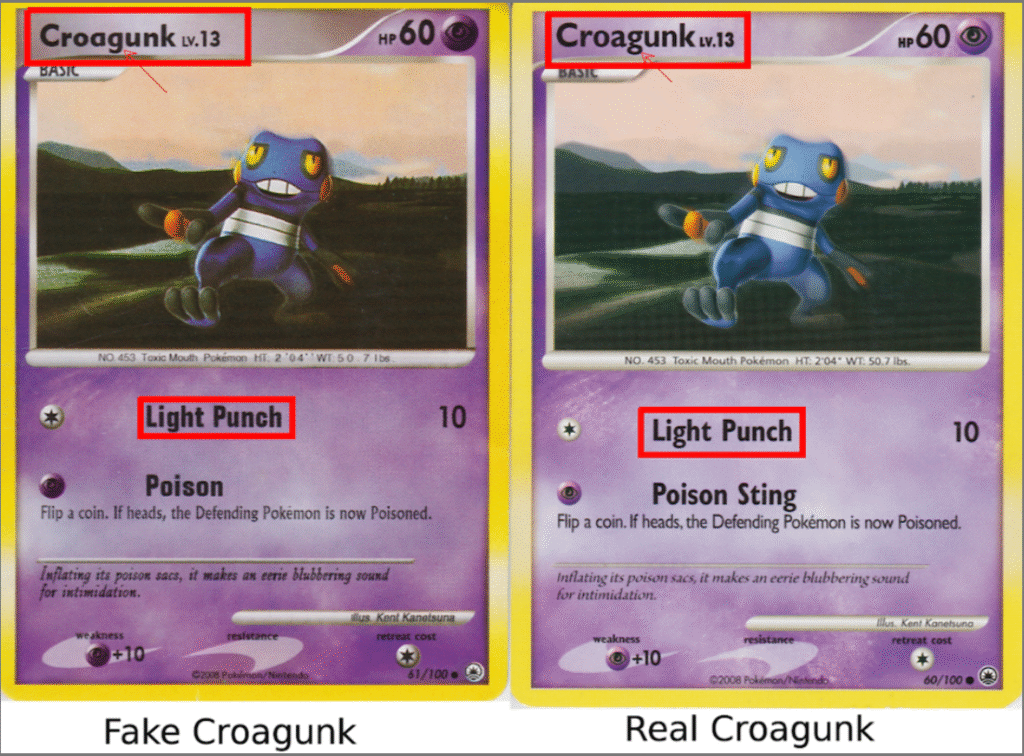 Vergelijk de tekst van de kaart goed: ontbreekt het streepje op de é in Pokémon, is het lettertype anders of staan de letters te ver uit elkaar? Dit zijn allemaal duidelijke ‘Red Flags’ van een neppe Pokémon kaart.